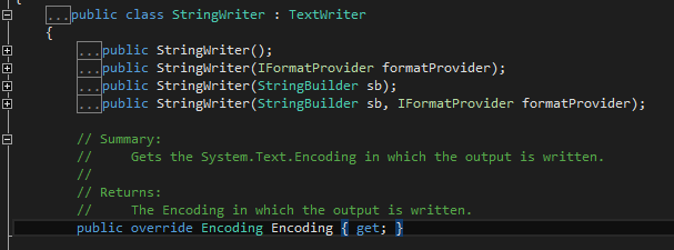 So the solution is to extend from StringWriter and add a new constructor that accepts Encoding. StringWriter already has an Encoding property as shown below, but unfortunately it doesn’t have a public setter so we need a subclass to fiddle with it.