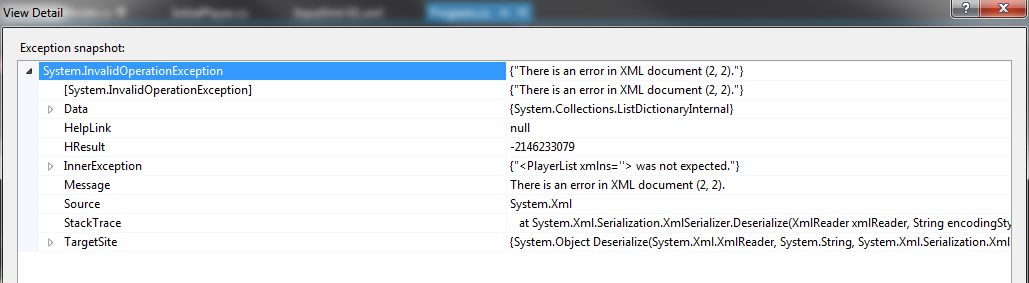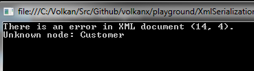XmlSerializer doesn’t complain at all. Instead it just returns an empty list because it cannot find any Player objects. In order to change this behaviour we can use the events it exposes such as UnknownNode, UnknownElement, UnknownAttribute. UnknownNode is just the combination of the first two events. In my case I didn’t want to be too strict so I didn’t want an exception in case of a missing attribute but hooked into the UnknownElement event: