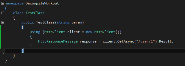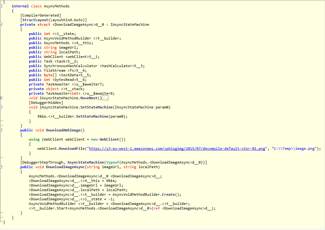 So let’s decompile the assembly to see how it works behind the scenes. This is one of the times I like having redundancy. Because Just Decompile failed to generate C# code for the class using async/await so I had to switch to ILSpy.