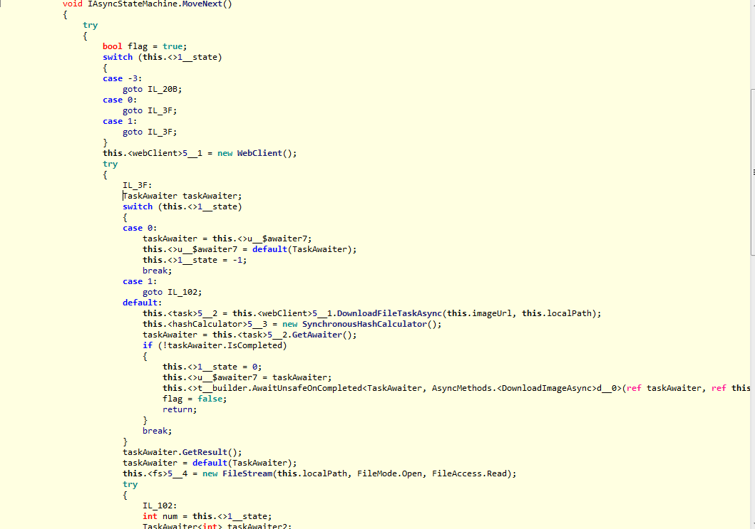 It generates a struct implementing IAsyncStateMachine interface. The “meaty” part is the MoveNext method: