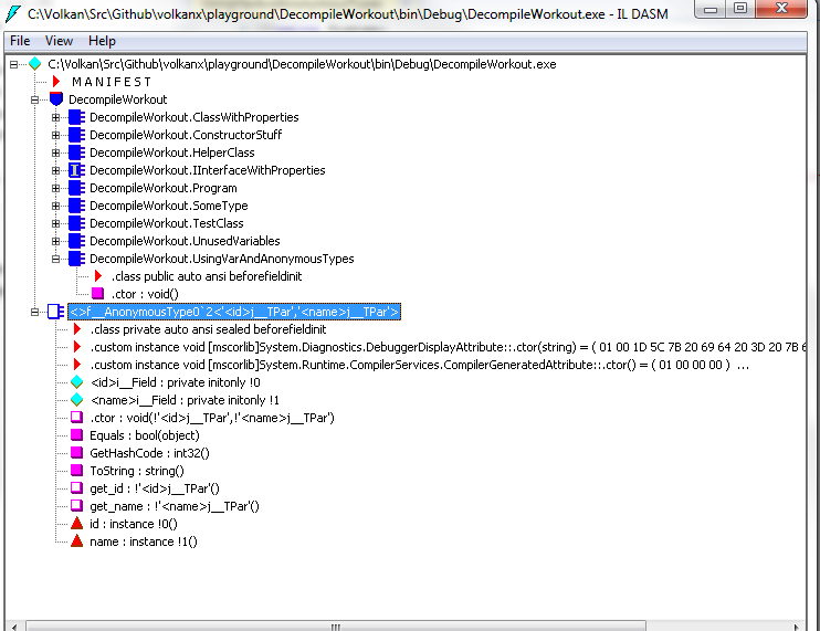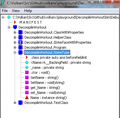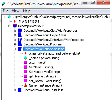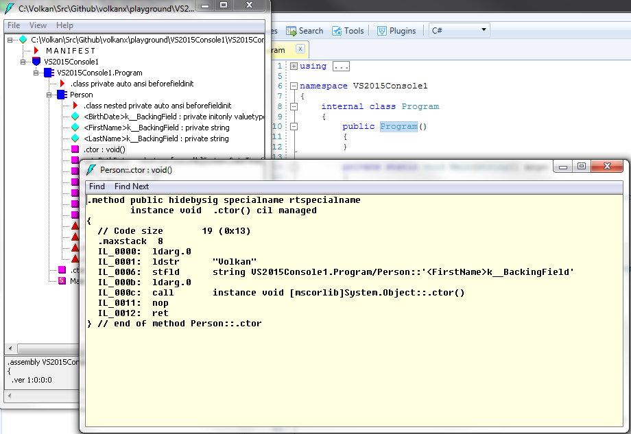 - ILDASM: Main tool I used is ILDASM (IL Disassembler). It’s installed with Visual Studio so doesn’t require anything special. It’s hard to make sense of IL but generally helpful to get an idea about what’s going on.