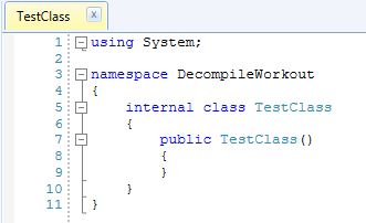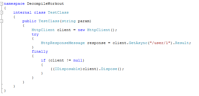 Decompiled code varies. Just Decompile doesn’t just displays the exact same statement as above. ILSpy on the other hand is closer to the IL: