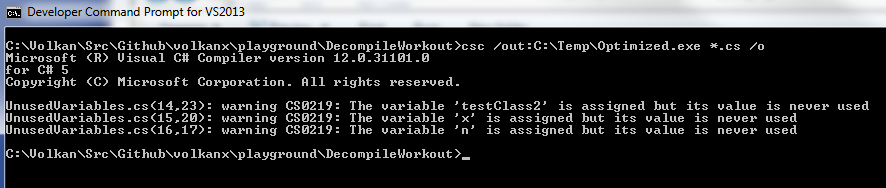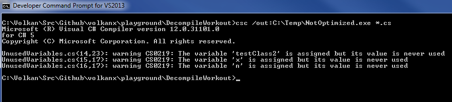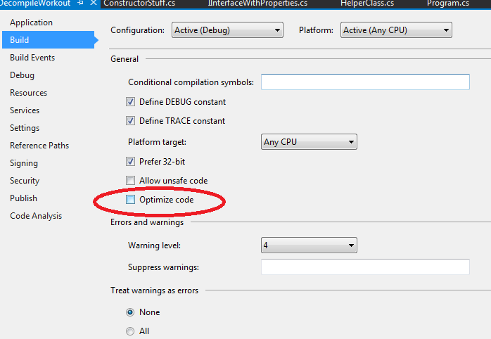 First, let’s have a look at the C# compiler’s behaviour. In Visual Studio, Optimize code flag can be found under Project Properties -> Debug menu