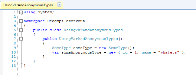 Decompiling the code doesn’t show the anonymous type side of the story but we can see that var keyword is simply replaced with the class type.
