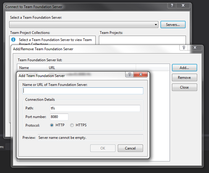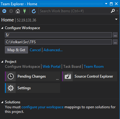 It can connect to TFS Online or Github. For this example I will use the hosted TFS we have just installed. We first need to add it to TFS server list.