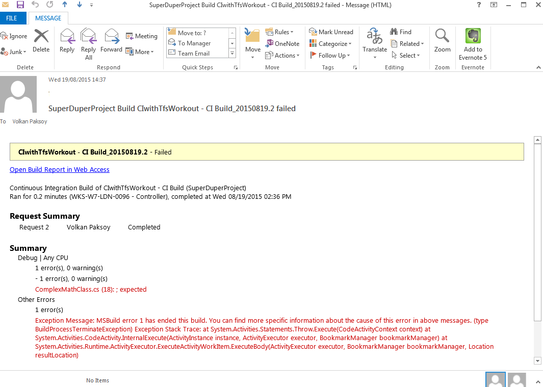 I intentionally broke the build and checked in my code and in a minute, as expected I received the following email: