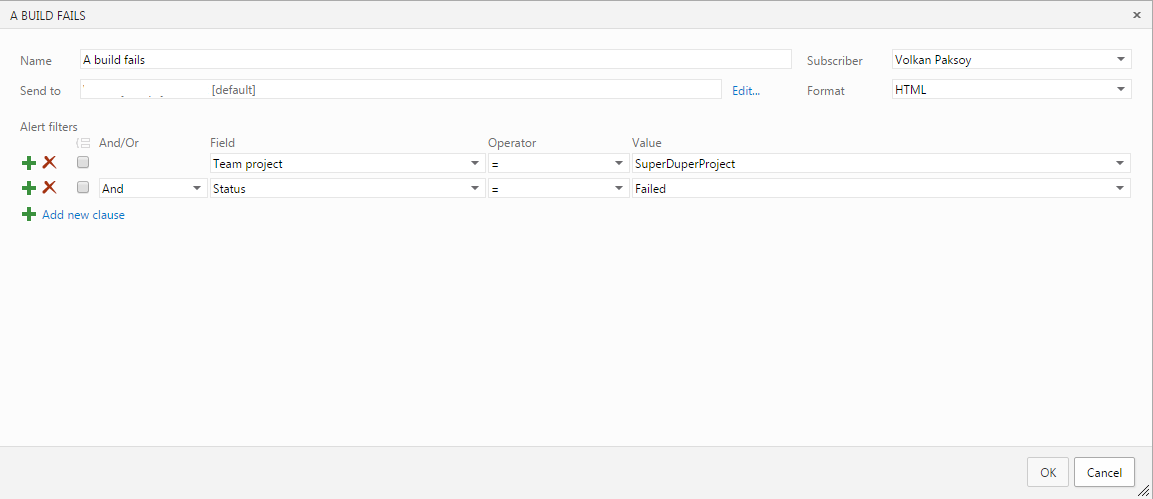At this point, our build definition is triggered automatically but we don’t get any notifications if the build fails (due to a compilation error for example). TFS comes with an application called Build Notifications. It pops up an alert but it requires to be installed on the developer machine so I don’t like this solution.