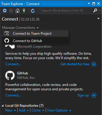 From the Team menu select Manage Connections. This will open Team Explorer on which we can choose the TFS instance.