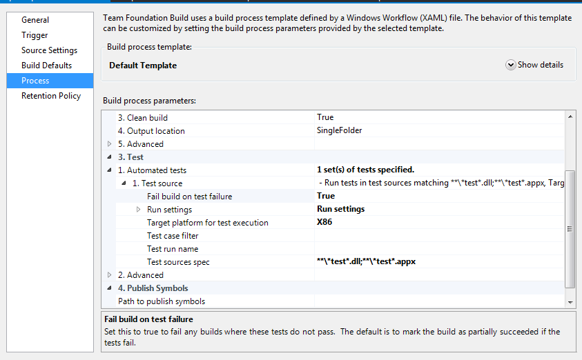 - Last required setting is failing the build when a test fails. It’s a bit buried so you have to go 3.1.1 Test Source and set “Fail build on test failure” to true.