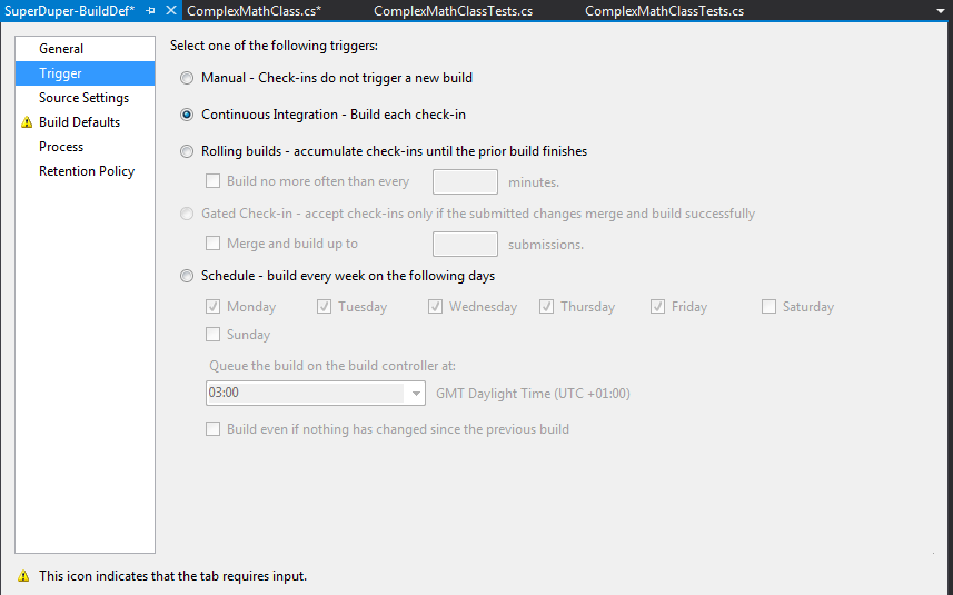- One important setting is the trigger: By default the build is not triggered automatically which means soon enough it will wither and die all forgotten! To automate the process we have to select Continuous Integration option.