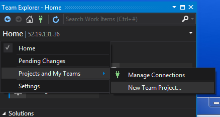 Now we can create a team project on TFS. click on Home -> Projects and My Teams then New Team Project.