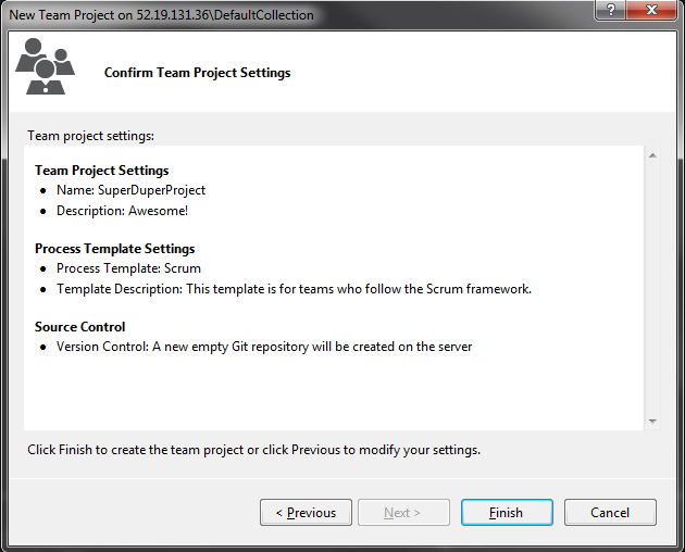 Just following the wizard selects Scrum methodology and Team Foundation Version Control as the source control system. Starting with TFS 2013, Git is also supported now.