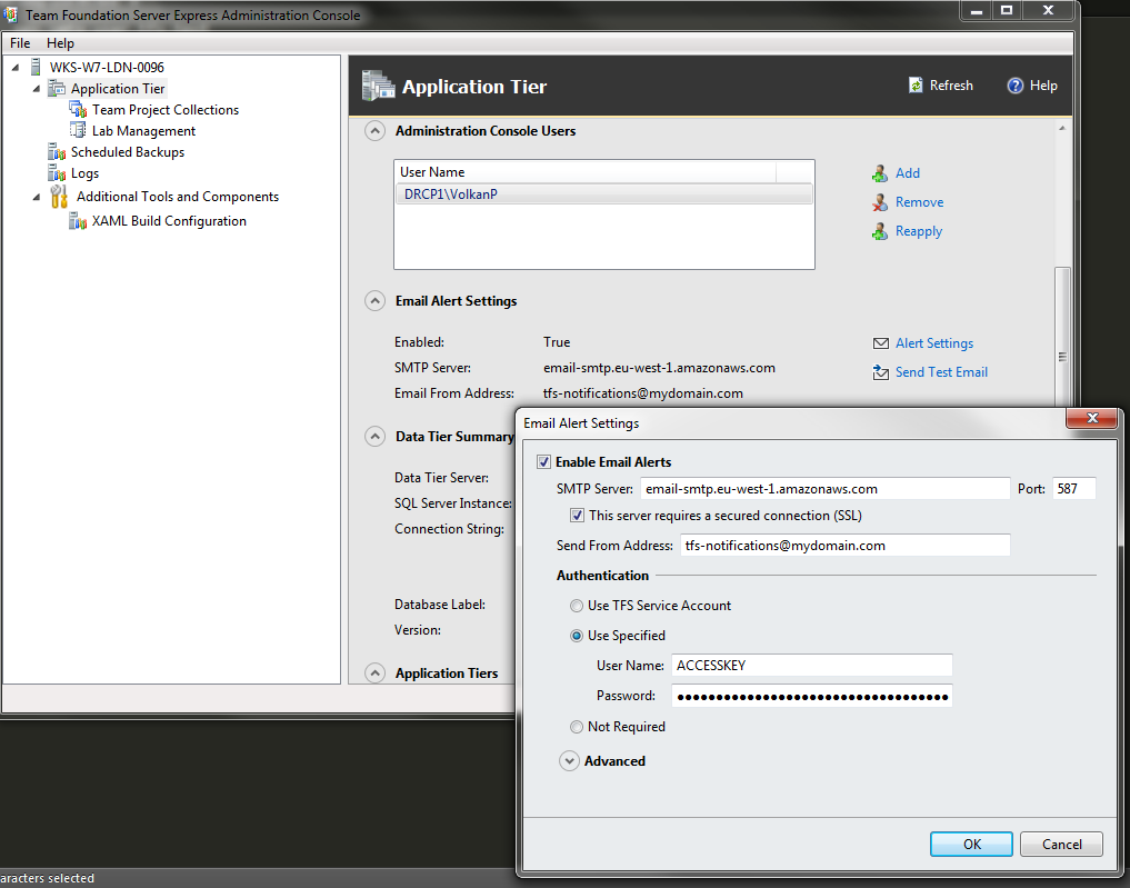 A better approach is enabling E-Mail notifications. In order to do that first we need to set up Email Alert Settings for TFS. In the Team Foundation Server Express Administration Console select Application Tier and scroll down to the “Email Alert Settings” section. enter the SMTP credentials and server info here.