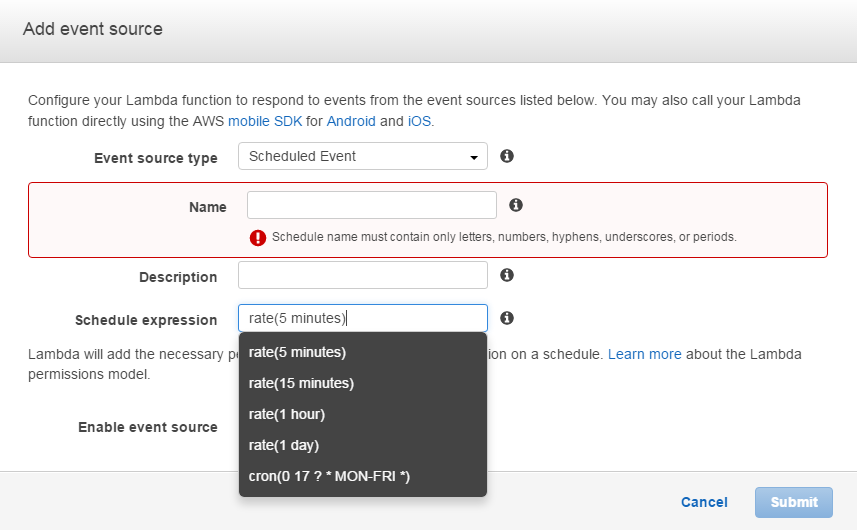 Just two days ago I was jumping through a lot of hoops (maintain state on S3, subscribe to public SNS topics) just to schedule a Lambda function, as explained here. If I knew all these problems were to be solved in a day, I would just wait! In re-Invent 2015 event AWS announced scheduled event support for Lambda functions.