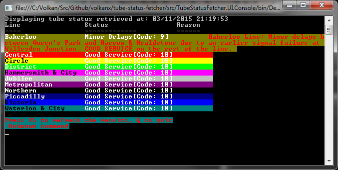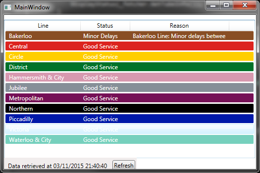 I will keep it around but in this initial version I won’t use it as description is returned with the status query anyway. But it was still a useful exercise to figure out there is no “official” colour for status values. After all what’s the colour of “No Step Free Access” or “Exist Only”? There is a also reason field that explains the effects of any delays etc. which should ne displayed along with the severity especially when there are some disruptions in the service.