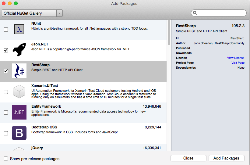 But wasn’t too hard to change the framework and make some small modifications to make it work. Good news is that it supports NuGet and most common libraries have Mono support including RestSharp and Newtonsoft.Json which I used in this project
