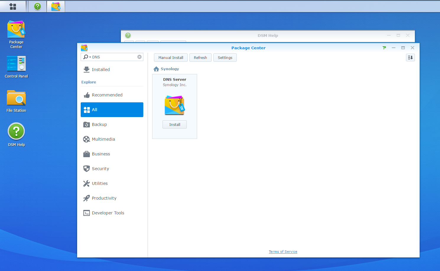 Step 01: First, I installed DNS Server package by simply searching DNS and clicking install on Package Center.