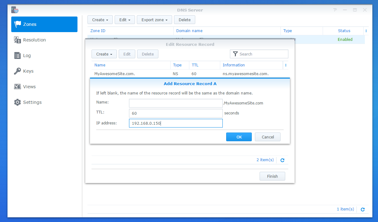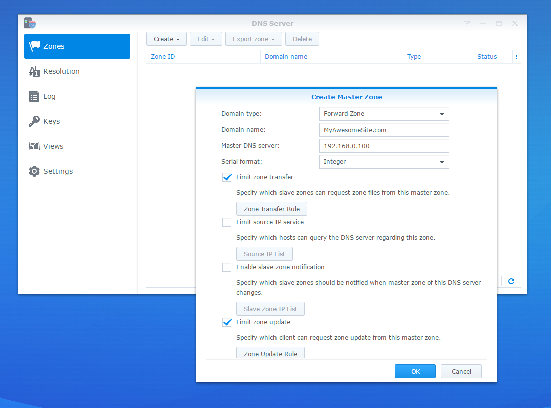 Step 02: Then, I opened the DNS Server settings and created a new Master Zone. I simply entered the domain name of my site which is hosted on IIS on my development machine and the local network IP address of the Synology as the Master DNS Server.