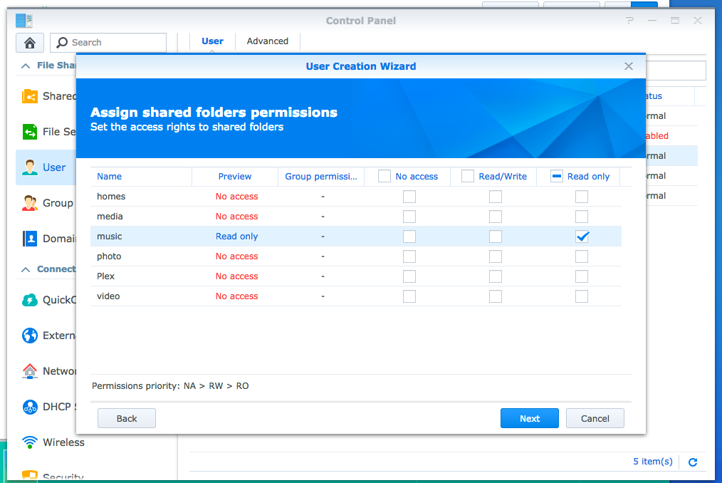By using Synology’s Control Panel you can use a specific user for listening to music only. This way even if your account is compromised the attacker will only have read-only access to your music library.