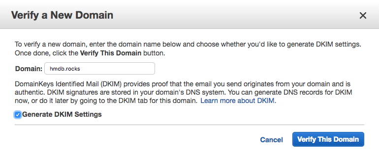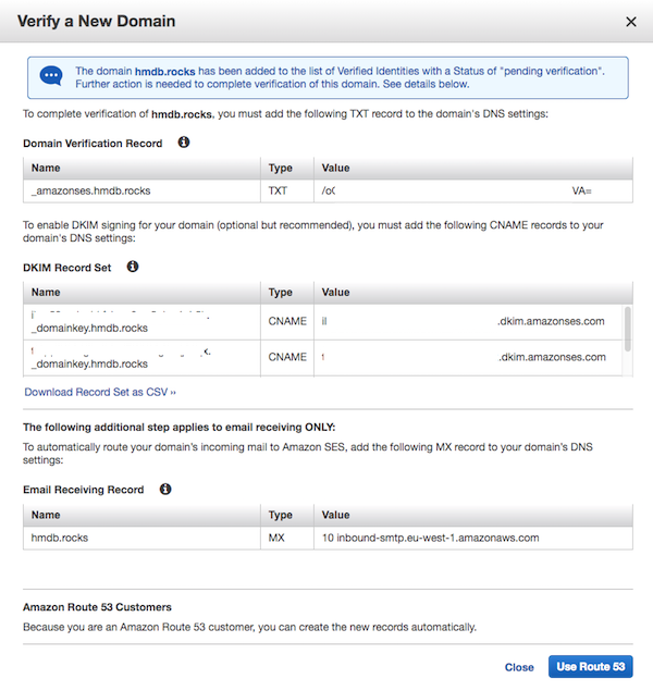 Go back to Domains page in SES console and make sure the verification has been completed successfully