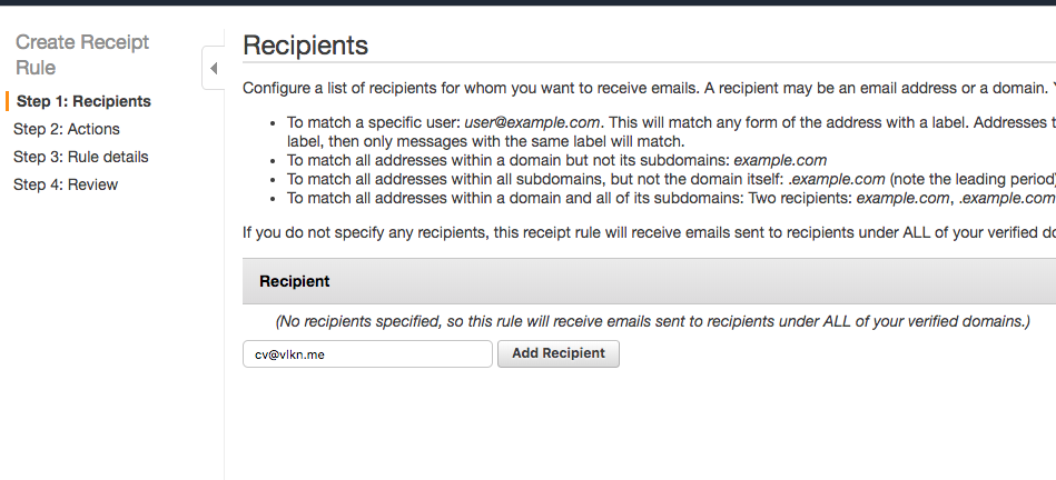 Step 4.1: In the Email Receiving section click on Rule Sets –> Create a Receipt Rule