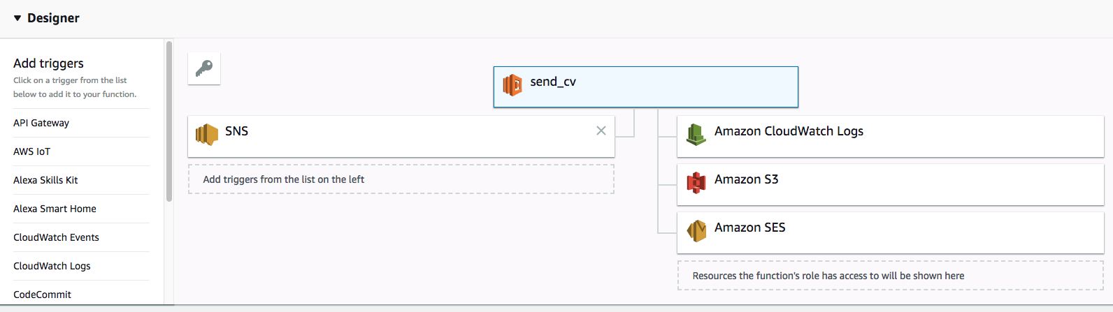 In my example, I store my CV in an S3 bucket. So the policy would need to receive SNS notifications, read access to S3 bucket and permissions to send emails.