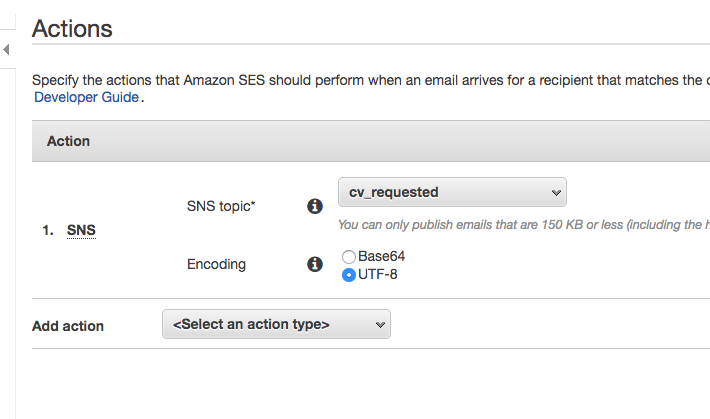 Now we choose what to do when an email is received. In this example I want it to be published to an SNS topic that I created earlier. I could invoke the Lambda function directly but leveraging publish/subscribe gives me more flexibility as in I can change the subscriber in the future or add more stuff to do without affecting the rule configuration.