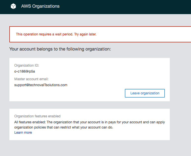 After I entered all the data and completed the setup steps, I clicked Leave organization and I got this error: