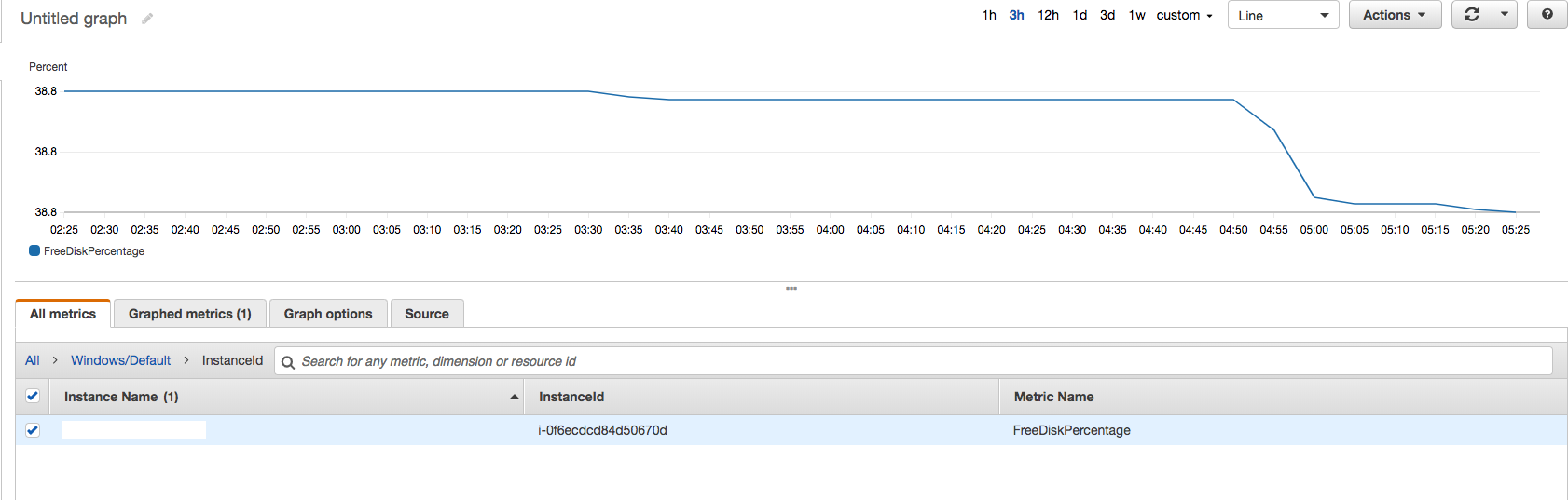 Once this is all done wait a few minutes and check CloudWatch metrics. Under All -> Windows/Default you should be able to see new metric under InstanceId group (as that’s what we are using to group the logs). And when you click the metric you should be able to see a nice time-based graph of free disk space on the server: