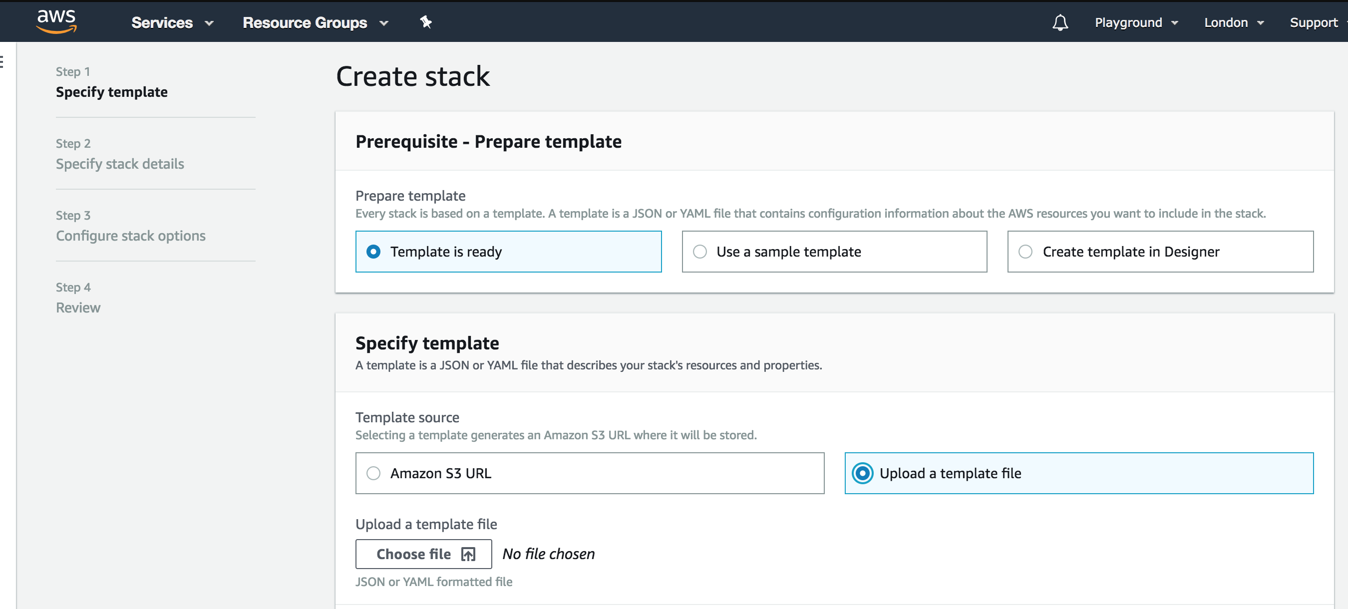 Step 2: Go to Stack and click Create Stack (Make sure you’re in EU London region otherwise AWS won’t be able to find the AMI specified in our template)