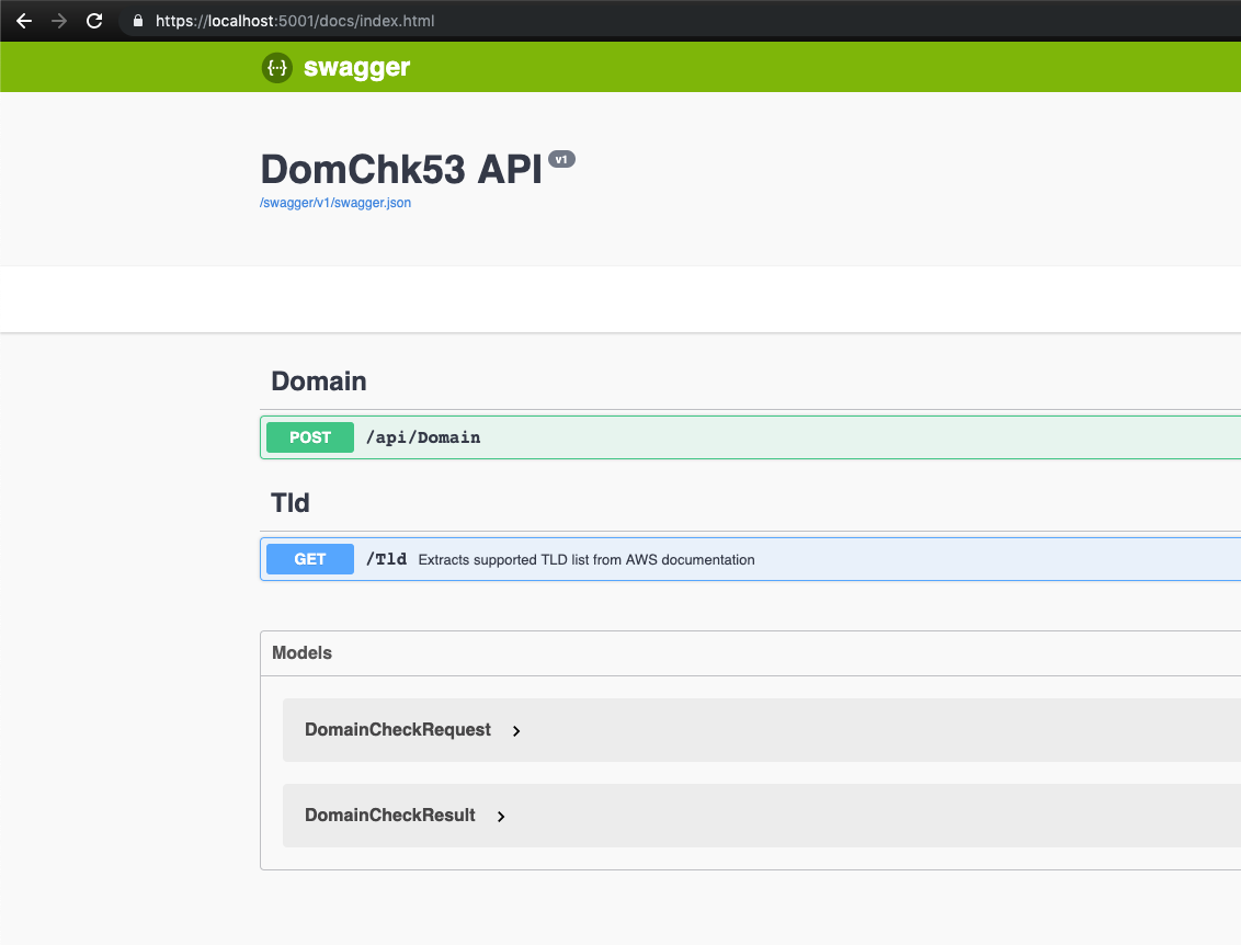 To use Swagger, simply run the Domchk53.API application and change the URL to https://localhost:{port number}/docs, port number being whatever your local web server is running on.