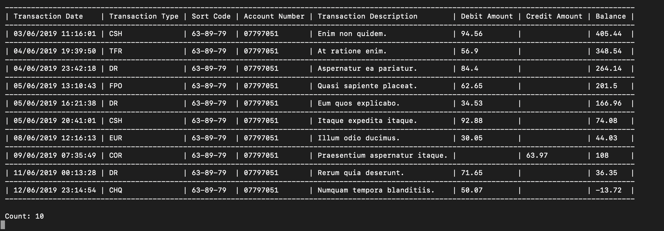 In this example I’ll generate fake bank statements. Normally they come in CSV files and have the following model: