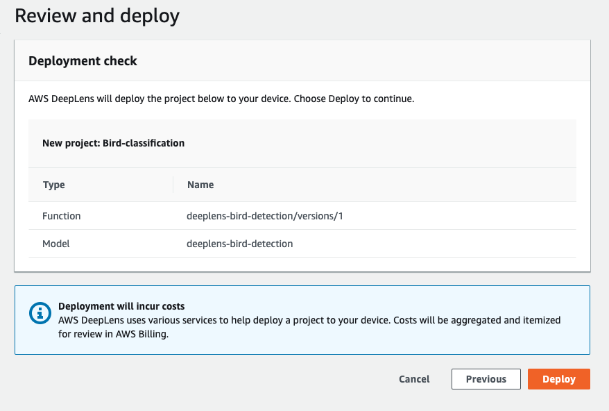 After that you choose your DeepLens from the avialble device list (in my case I had one device) and click Review then Deploy