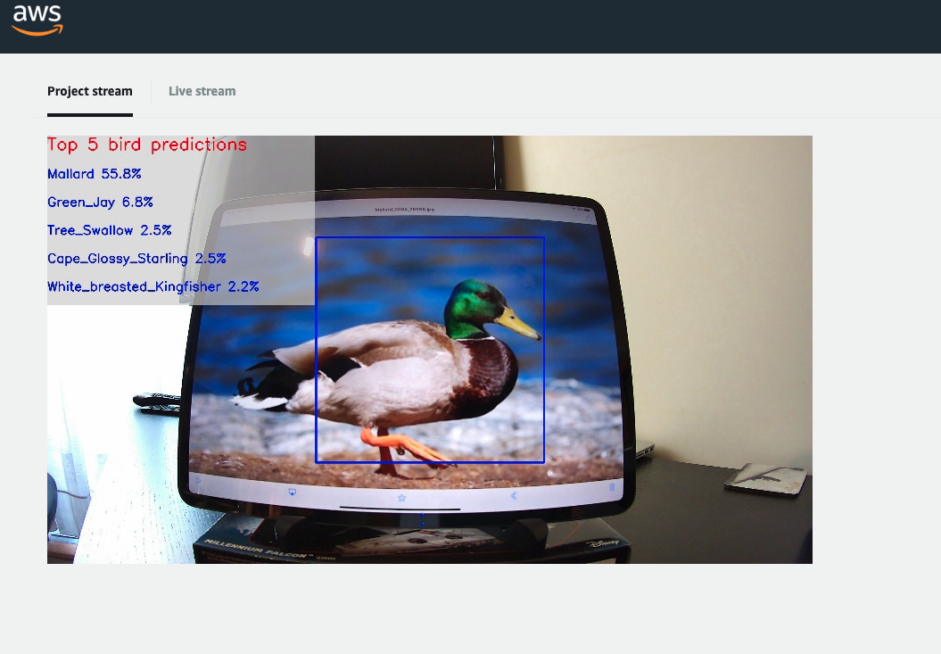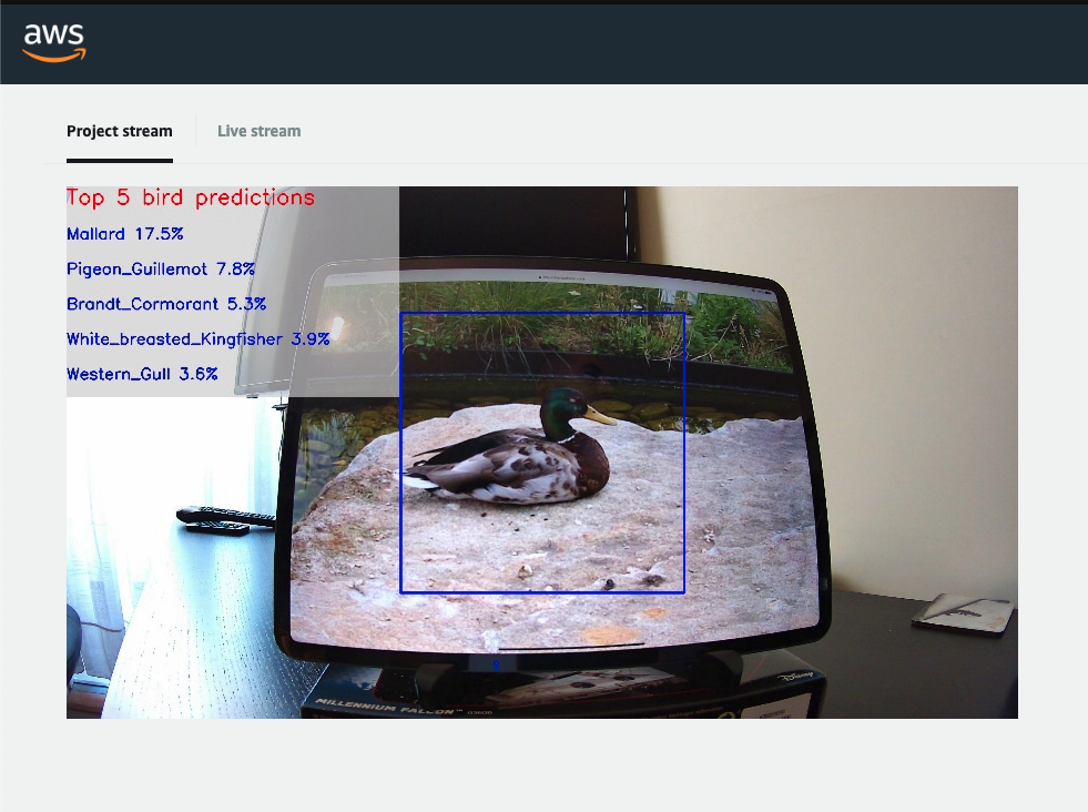 Next test is the bird I saw on the roof and identified as a Mallard. Let’s see what DeepLens thinks about it: