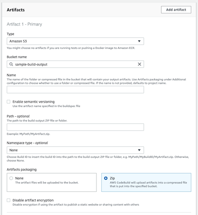 The options are pretty basic. You can choose to compress the output and upload as a single zip file or the artifacts you defined in the buildspec in their original format.