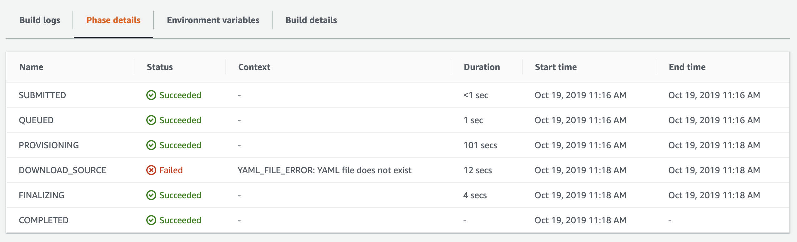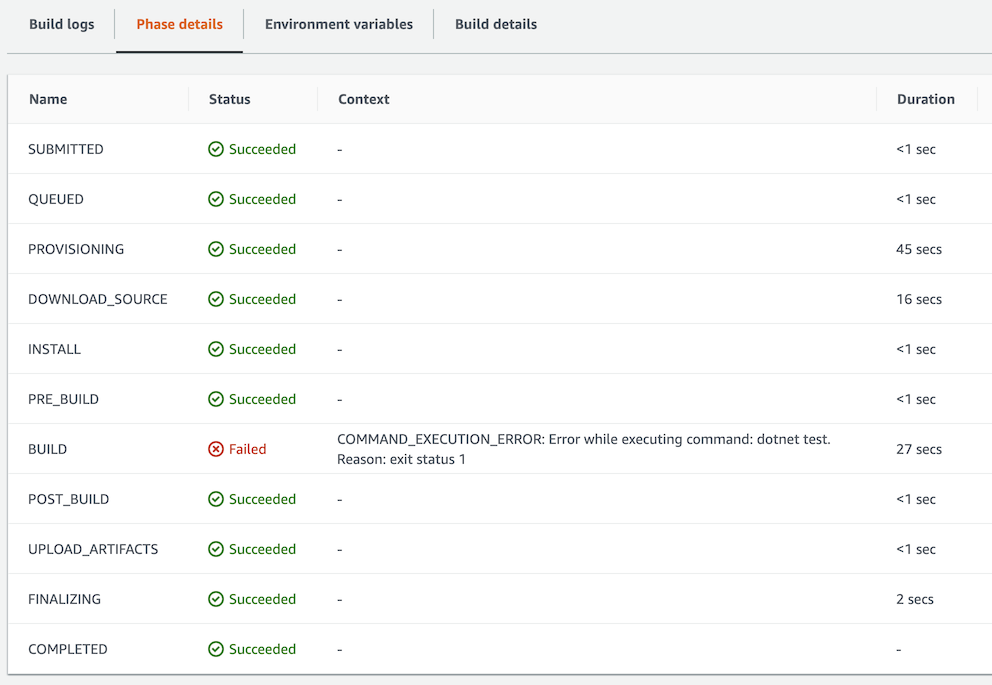 So it actually runs the tests and fails the build if there’s a failing test. Ideally you want to run the tests whenever there are code changes. Looks like currently this is possible via CodePipeline service. I’ll explore that later and will cover running the build and unit tests automatically.