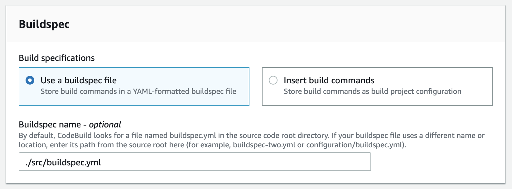 By default CodeBuild requires a special configuration file called buildspec.yml to reside at the root of the repository:
