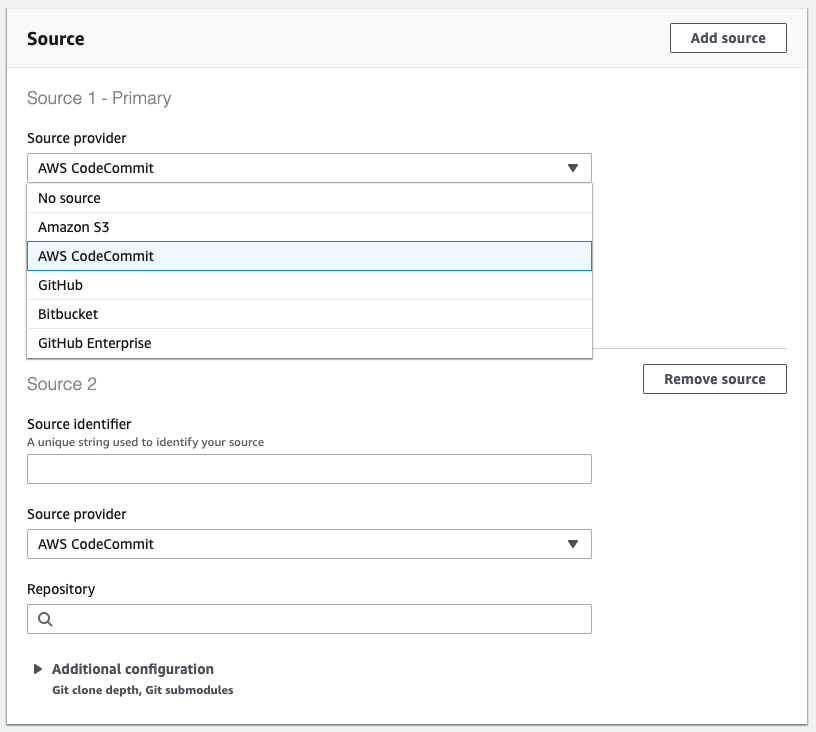 First step is to select the source. It’s quite flexible in the sense that it integrates with top Git providers such as GitHub and Bitbucket. The easiest way is to use CodeCommit because of the direct integration between services. No extra authentication is required to connect to the repository.