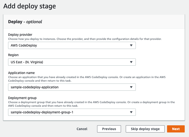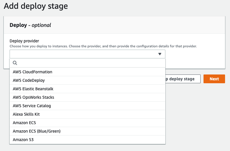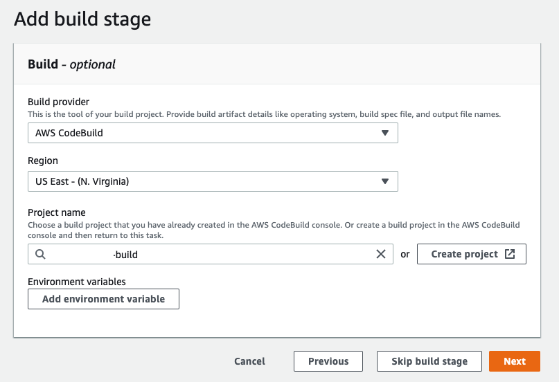 You can also choose to skip this stage. If you are copying static assets from an S3 bucket for instance you wouldn’t need to build anything and would choose to skip this stage.