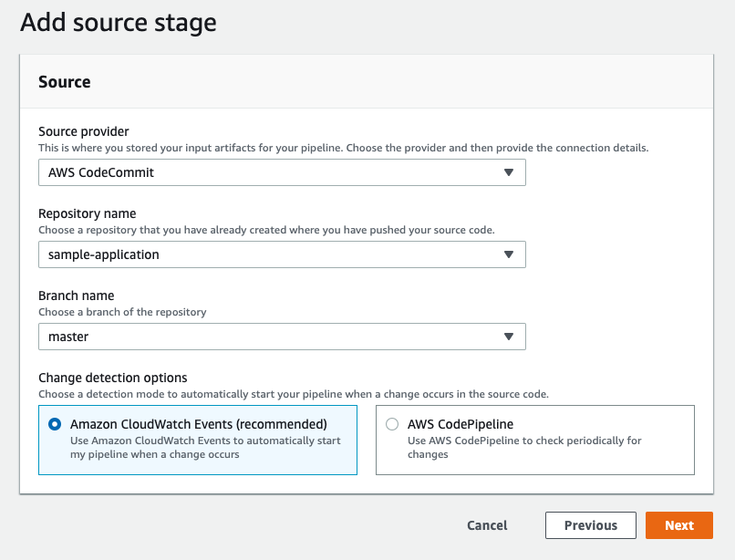 Next, we choose the source provider. In this example, I will use CodeCommit. It also support Amazon ECR, Amazon S3 and GitHub.