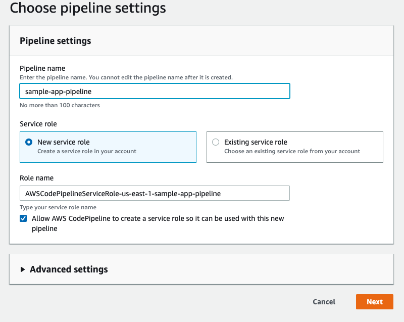 First step is to simply give the pipeline a name. CodePipeline can automatically create an IAM role with the required permissions. Required permissions are not really clear at this point as we haven’t connected any of the services yet. That’s why it’s very useful to keep the “Allow AWS CodePipeline to create a service role so it can be used with this new pipeline” checkbox ticked.